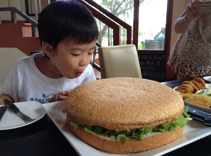 กินแฮมเบอร์เกอร์ XXL ที่มีเนื้อ 2 ชิ้น
